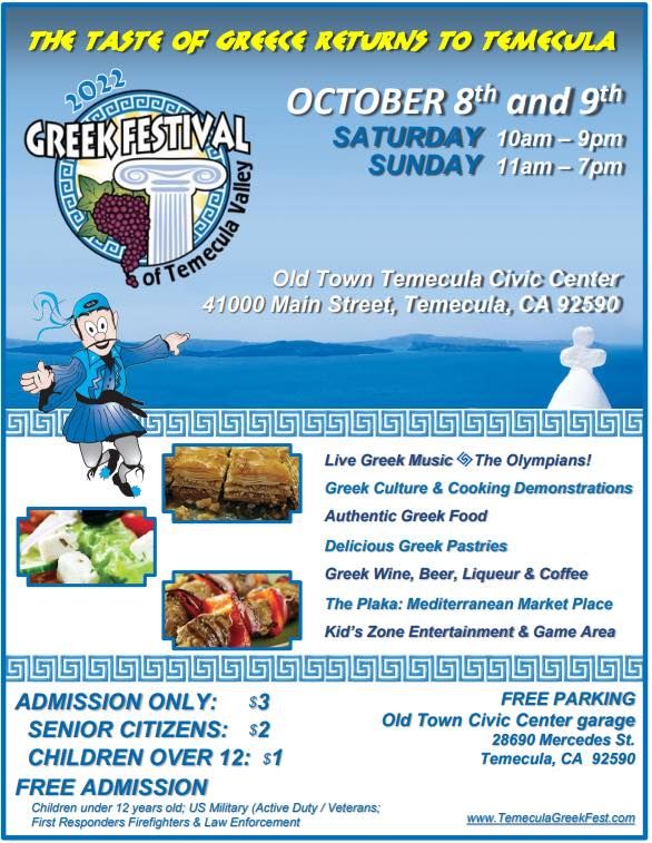 Temecula Greek Festival Temecula City Hall October 8 to October 9, Enjoy greek history, culture, music and food at temecula greek festival. Welcome to the annual temecula greek festival.